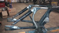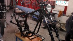 vorbereitet als "Rolling Chassis" Rahmen geändert und schwarz gepulvert Schwinge gepulvert vorverlegte Fussrasten Fender vorn Original gekürzt, hinten neu Solo - Sitz Gabel überarbeitet Heritage Felgen neu aufgebaut Speichen poliert, Felgenring weiss - Naben in schwarz